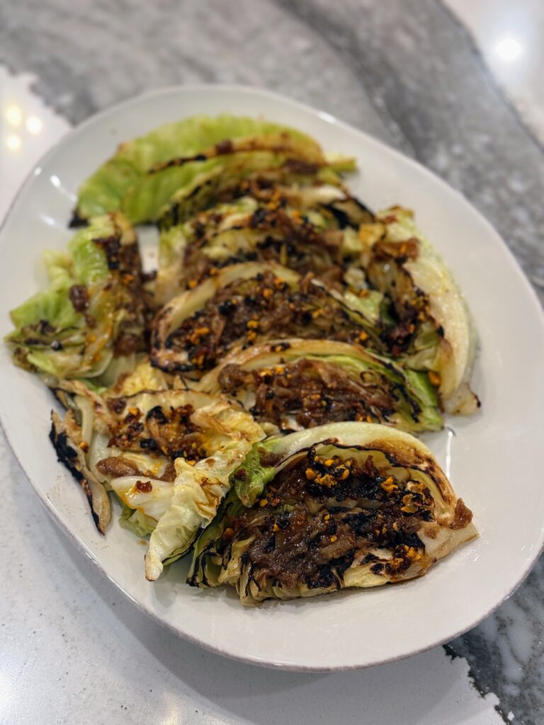 - To serve, spread 1 1/2 teaspoons reserved garlic chutney over charred sides of each cabbage wedge; drizzle each wedge with 2 teaspoons chili crisp.