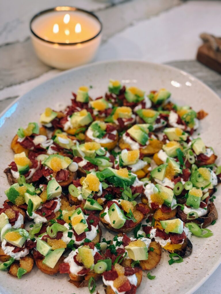 6. Arrange potatoes on a platter or divide among plates. Top each with avocado, seasoned sour cream, some turkey bacon, green onion, caviar, and more herbs.